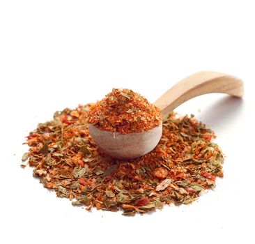 ausgewogener Rub aus Meersalz, edelsüßer Paprika, Petersilie, Knoblauch, Majoran, Bockshornkleesaat, Chilischrot, Kümmel, Muskatnuss