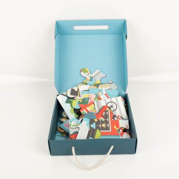 Praktische bedruckte Pappschachtel mit Baumwoll-Tragegriff, schön zum Verschenken und einfach zum Aufbewahren