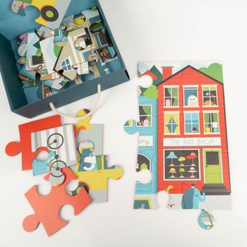 Großes Fußboden-Puzzle von Rex London mit 24 Teilen und farbenfroher Straßenszene voller tierischer Figuren und liebevoller Details
