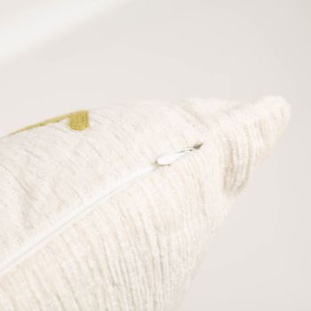 Die Kissenhülle besteht aus weicher Chenille und fühlt sich angenehm an. Auf der Vorderseite sorgen getuftete und gestickte Blumenmotive für eine besondere Oberfläche mit Tiefe und lebendiger Struktur. Genau dieses Zusammenspiel macht das Kissen spannend, dekorativ und hochwertig in seiner Wirkung.