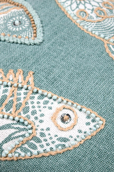 Was dieses Kissen so besonders macht, sind die aufwendigen Details. Jeder Fisch ist mit viel Liebe zum Detail gestaltet: