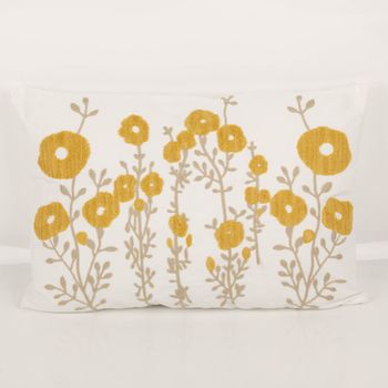 Dekokissen 40 x 60 cm in Wollweiß mit gelben getufteten Blüten und gestickten Blättern sowie Stielen in Beige für eine freundliche und natürliche Wohnatmosphäre