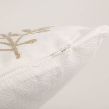 Durch das Zusammenspiel aus Tuftung und Stickerei wirkt das Kissen lebendig und hochwertig. Gerade auf einfarbigen Sofas oder in Kombination mit weiteren Naturtönen kommt das florale Motiv besonders schön zur Geltung.