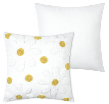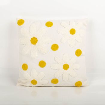Du möchtest ein Kissen, das sofort nach Frühling, Leichtigkeit und gemütlichem Zuhause aussieht? Das Kissen Camille bringt getuftete Blüten in wollweiß mit sonnig gelben Blütenmitten auf eine ruhige Basis. Die strukturierte Tufting-Optik macht den Look lebendig und fühlt sich gleichzeitig angenehm weich an – perfekt, wenn du in deinem Wohnbereich natürliche Akzente setzen willst.