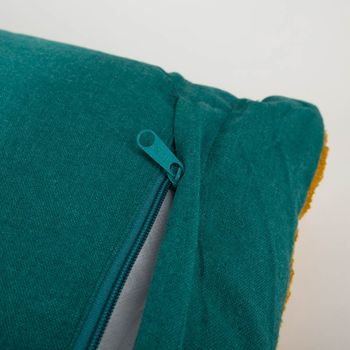 Du suchst ein modernes Statement-Piece? Dieses Kissen kombiniert eine strukturierte Vorderseite mit verschiedenen Texturen und klaren, geometrischen Formen. Die Rückseite ist aus uni türkiser Baumwolle gefertigt – pur, griffig und perfekt zum Kombinieren. Durch den Reißverschluss beziehst du das Kissen schnell; das Füllkissen ist bereits inklusive.