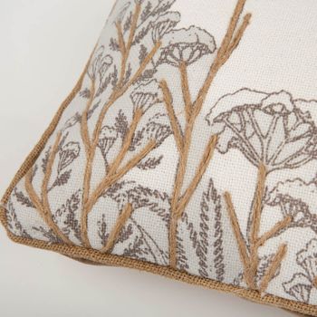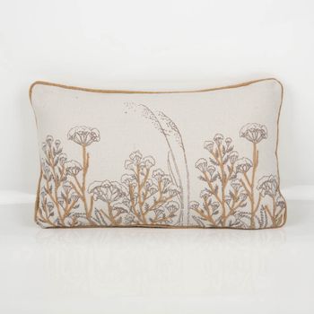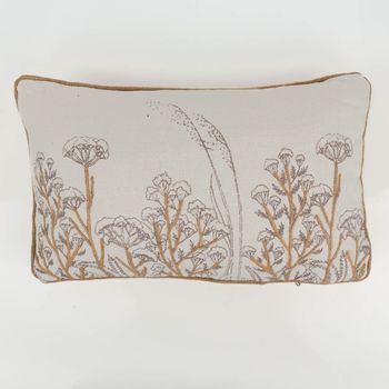 Du liebst natürliche Akzente? Dieses rechteckige Kissen bringt Ruhe und Leichtigkeit in dein Zuhause. Auf der weißen Vorderseite treffen dezente Blumen- und Gräsermotive auf applizierte Naturfaser-Details; die Kederumrandung in Natur setzt einen klaren Rahmen. Dank Reißverschluss auf der Unterseite lässt sich der Bezug schnell abnehmen – das Füllkissen ist schon dabei.